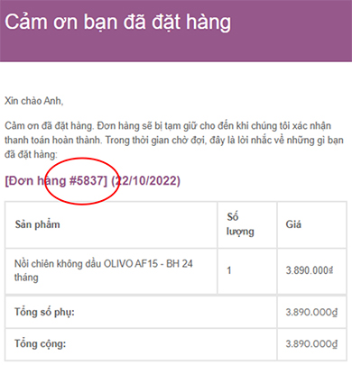 Sau khi đặt hàng trên Website thành công. Hệ thống sẽ gửi Email thông báo cho khách hàng về việc ĐƠN HÀNG ĐÃ ĐƯỢC ĐẶT (Email này có thể nằm trong thư mục SPAM. Quý khách cần kiểm tra trong thư mục đến và cả thư mục Spam)