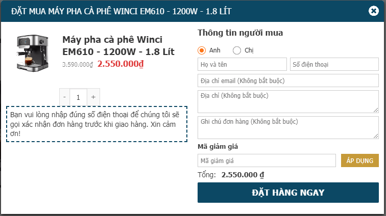 - Quý khách hàng điền các thông tin đầy đủ như: Tên, Địa chỉ, Số điện thoại, Email,.. sau đó nhấn nút đặt hàng.