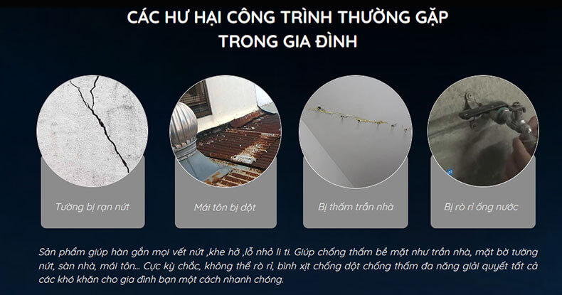 – Phủ lên vết nứt tường nhà, đường ống dẫn nước, các hạng mục có khe hở nhỏ như lỗ đinh trên mái tôn… vết nứt trên thùng nhựa hoặc ca nước…