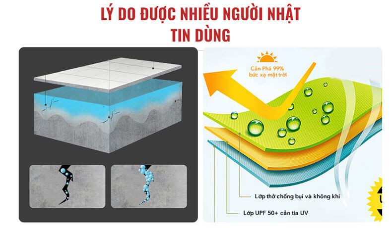 Kháng tia UV, chịu mài mòn tốt không cần vữa bảo vệ, để lộ thiên, chống thấm triệt để ngăn thấm nước từ ngoài vào làm loang lỗ mất thấm mĩ, nấm mốc, ẩm ướt.
