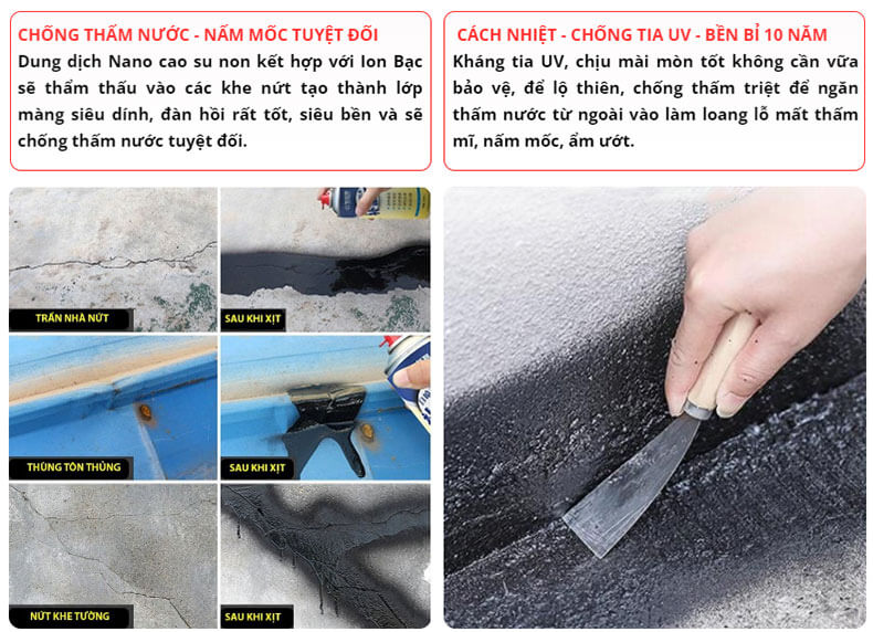 Dung dịch Nano cao su non kết hợp với Ion Bạc sẽ thẩm thấu vào các khe nứt tạo thành lớp màng siêu dính, đàn hồi rất tốt, siêu bền và sẽ chống thấm nước tuyệt đối.