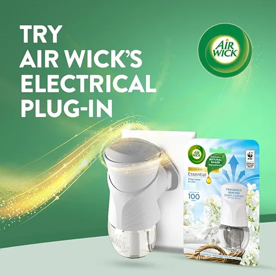 Bộ tinh dầu cắm điện Air wick 19ml. Hàng chính hãng, xuất xứ Hungary (EU). 5 Chế độ khếch tán. Hương thơm kéo dài đến 120 ngày. Sử dụng cho phòng 30 – 35m2