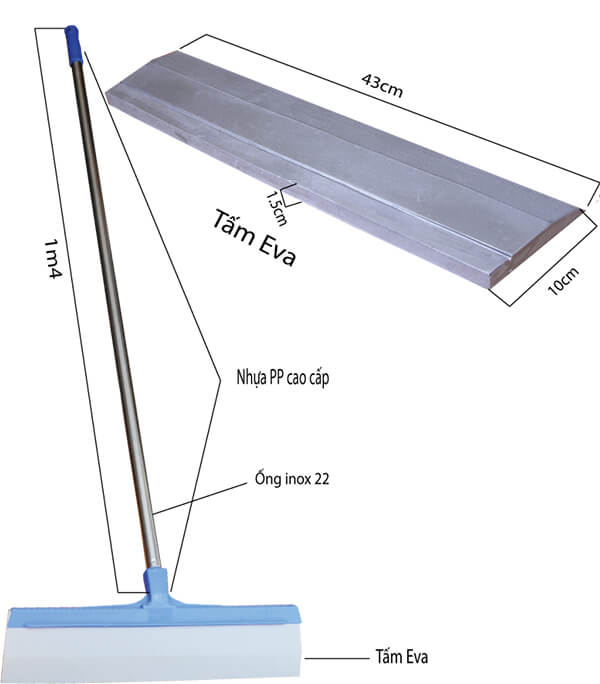 | Kích thước | Tấm EVA: (Dải x Rộng x Cao): 43x10x1,5 cm Cán Inox: Dài 1.4m, Ø 22 mm |