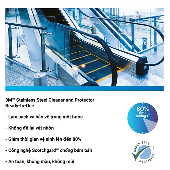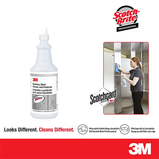 3M™ Stainless Steel Cleaner & Protector with Scotchgard™: Sử dụng làm sạch bóng bề mặt thép không rỉ, Crom và nhựa không để lại vết với một công thức độ bóng cao. Sản phẩm dùng lau sạch bề mặt, ngăn ngừa các vết bẩn bám trở lại, chống dấu vân tay trên bề mặt. Và bảo vệ bề mặt