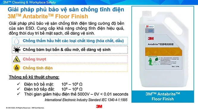 – Chỉ số hiệu suất phân tán tĩnh của sáp chống sàn 3M đáp ứng các tiêu chuẩn của tiêu chuẩn ngành công nghiệp điện tử theo tiêu chuẩn quốc tế IEC 1340-4-1: 1995.