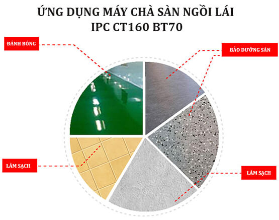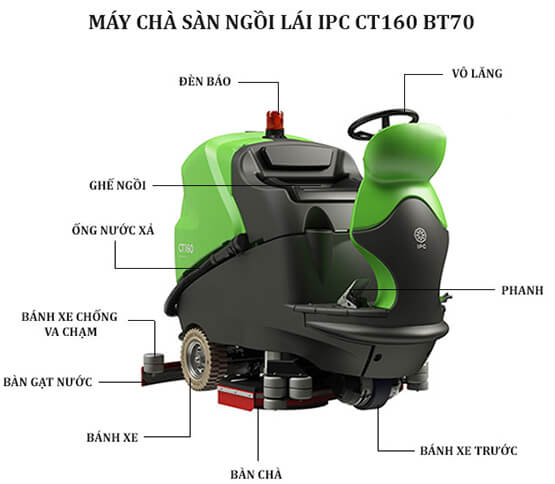 Máy chà sàn liên hợp IPC CT160 BT70 (Ngồi lái). Công suất làm sạch 4200 m2/h, Thời gian làm việc liên tục: 4 – 6h. Phù hợp quy mô rộng. BH 18 tháng