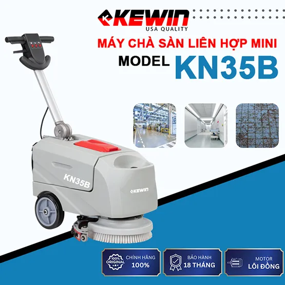 Máy chà sàn liên hợp Kewin KN35B. Chạy pin DC24V. Chà khoẻ, giá rẻ – Tiết kiệm điện, tiết kiệm nước. Công nghệ USA, khả năng làm sạch tuyệt vời. BH chính hãng 18 tháng