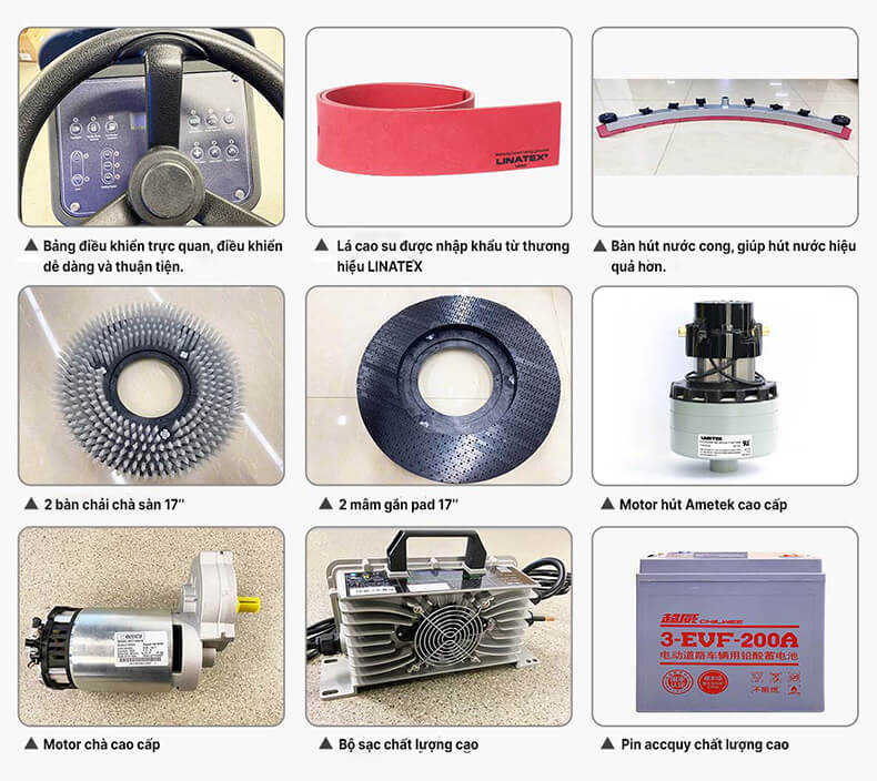 | Phụ tùng | 2 Bàn chải chà sàn, 04 bình acquy, 01 Bộ sạc acquy |