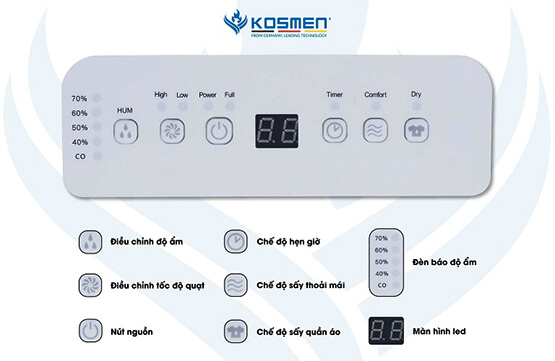 - Máy hút ẩm Kosmen KM-12N hỗ trợ cài đặt trước chỉ số độ ẩm và tự động tắt theo yêu cầu.