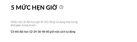 – Chức năng hẹn giờ có 5 mức từ 12 – 60 giờ cho bạn chủ động được thời gian hiệu quả.