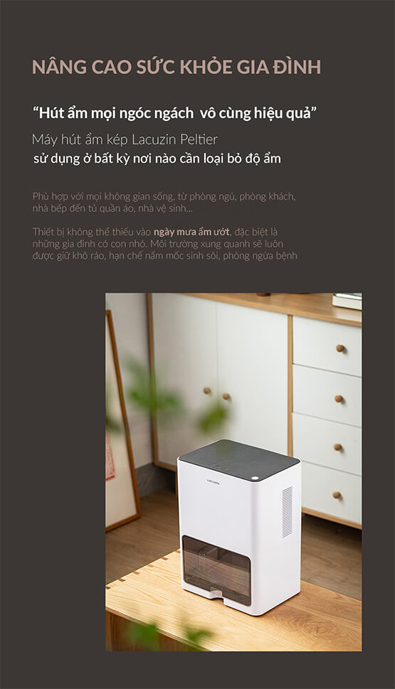 Máy hút ẩm Lacuzin Dual Peltier có thể sử dụng ở bất kỳ căn phòng nào trong ngôi nhà của bạn, từ phòng ngủ, phòng khách, nhà bếp cho đến tủ quần áo, nhà vệ sinh,… Đây là thiết bị không thể thiếu vào những ngày mưa ẩm ướt, đặc biệt là những gia đình có con nhỏ. Môi trường xung quanh sẽ luôn được giữ khô ráo, hạn chế nấm mốc sinh sôi, phòng ngừa bệnh ngoài da cho các bé.