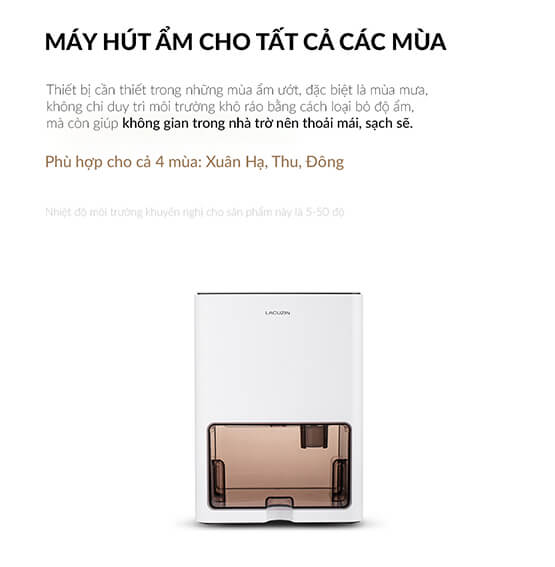 – Máy được trang bị bộ cảm biến nhiệt độ duy trì công suất hút ẩm đồng đều trong nhiệt độ môi trường từ 5 – 50 độ C phù hợp sử dụng 4 mùa quanh năm