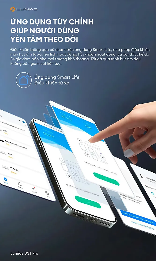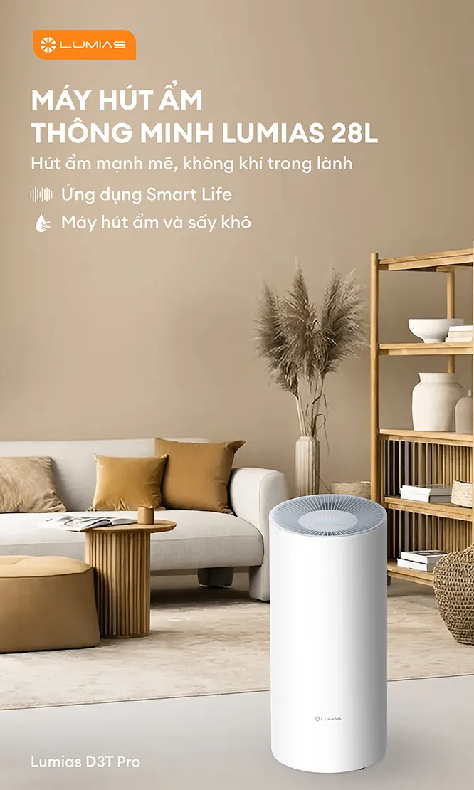 Máy hút ẩm không khí thông minh Lumias D3T Pro. Công suất 28L/ngày hiệu quả trên diện tích 125m², tích hợp wifi được điều khiển qua ứng dụng App Smart Life