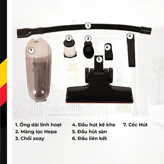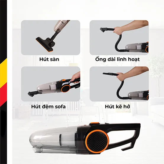 Đi kèm với máy hút bụi là nhiều đầu hút giúp hút sạch bụi bẩn ở nhiều vị trí khác nhau như đầu hút sàn, đầu hút khe cửa, bàn trà sàn bếp, ống hút.