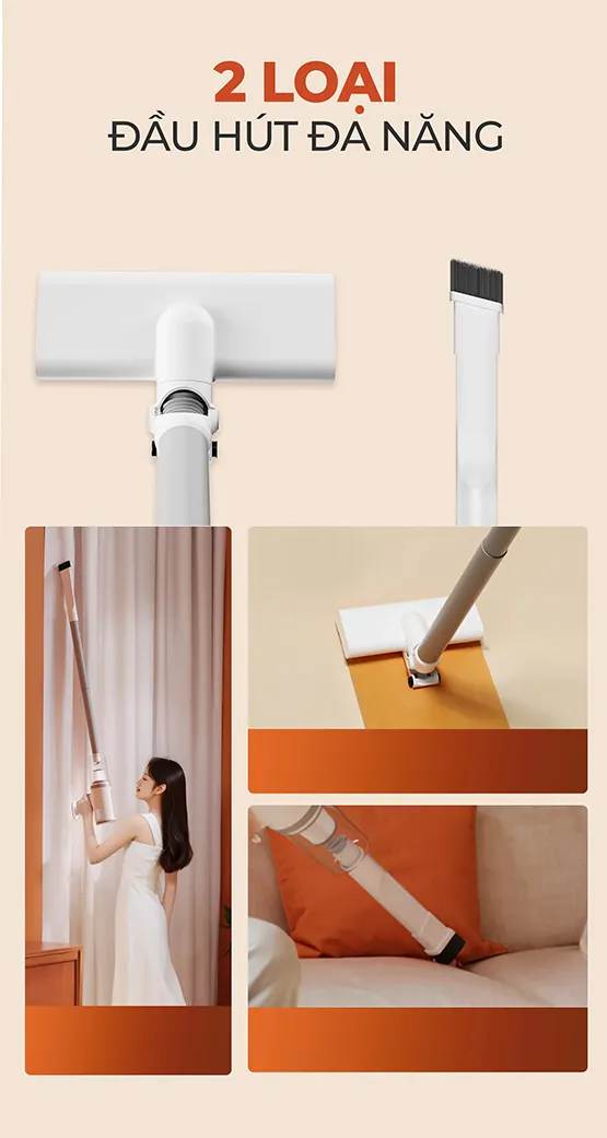 – 2 loại đầu hút linh hoạt:Đầu hút sàn: loại bỏ bụi bẩn trên sàn nhà; Đầu hút bàn chải: giúp làm sạch mọi vết bẩn một cách hiệu quả.