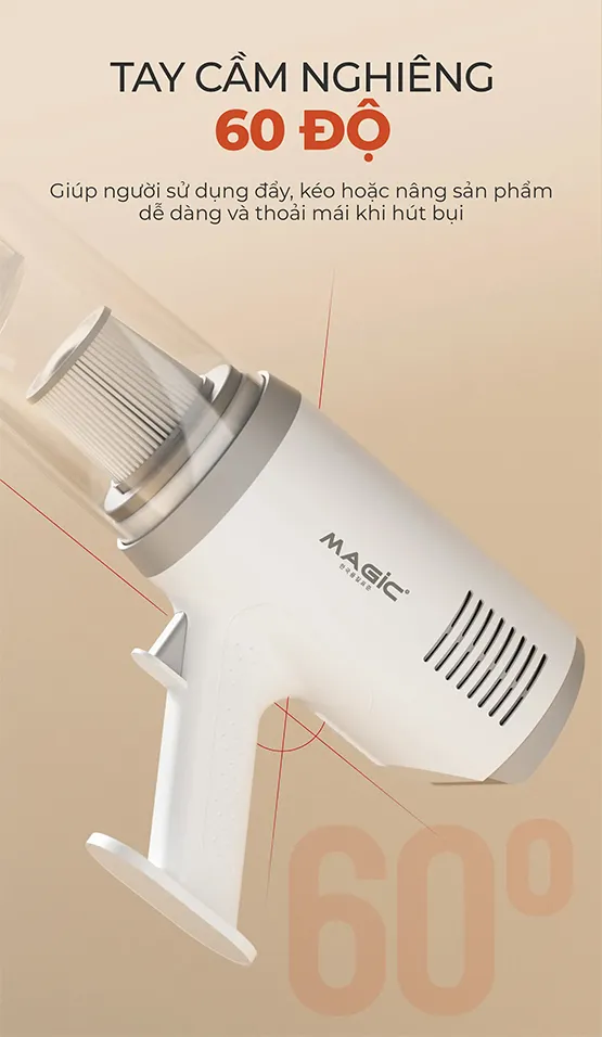 Với tay cầm nghiêng 60 độ, việc đẩy, kéo hoặc nâng máy hút bụi trở nên dễ dàng và thoải mái, giúp người sử dụng có trải nghiệm sử dụng thuận lợi và tiện ích hơn.