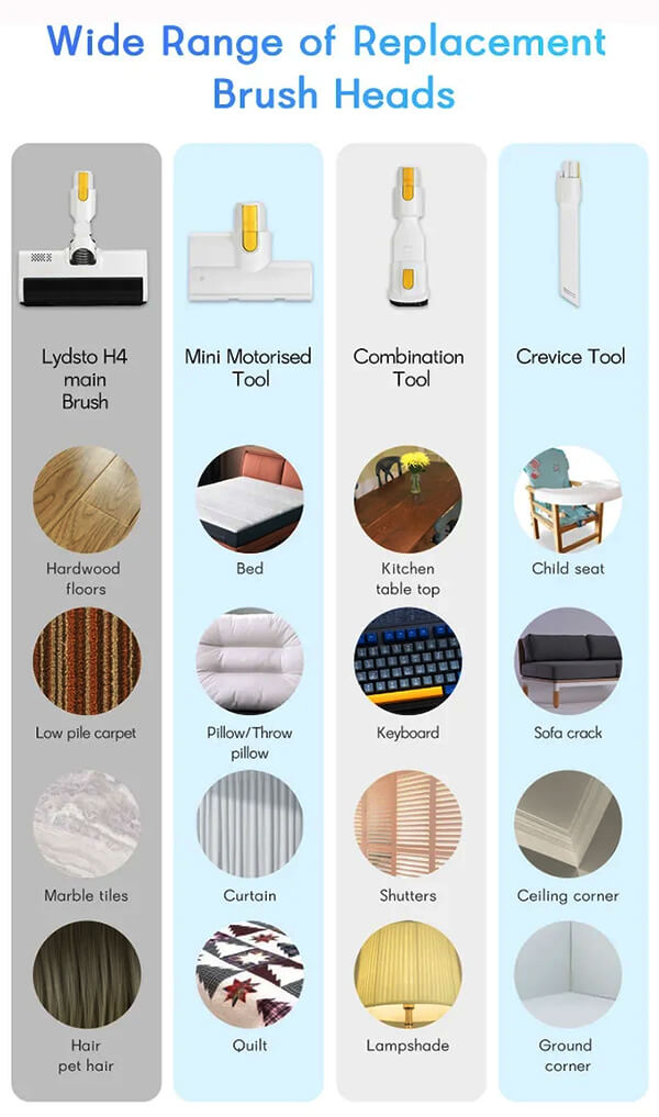Đặc biệt, khi mua Lydsto H4, bạn sẽ được nhận thêm một số phụ kiện giúp xử lý nhưng vị trí khó tiếp cận, bao gồm: Thanh nối, đầu hút dẹt để hút các kẽ hở, đầu hút giường nệm, đầu hút rèm cửa… hoàn toàn miễn phí, giúp việc dọn dẹp của bạn dễ dàng hơn bao giờ hết.