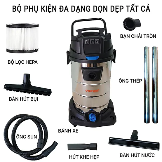 Phụ kiện | 1 ống sun, 1 bàn hút khô, 1 bàn hút ướt , 1đầu hút khe, 1 đầu chổi tròn, 1 túi lọc vải tiêu chuẩn, 1 bộ lọc HEPA, 2 ống nối inox |