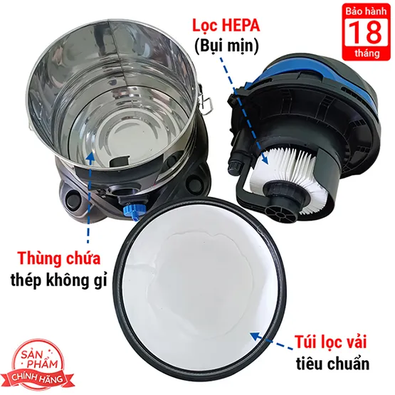 | Phụ kiện | 1 ống sun, 1 bàn hút khô và ướt kewin, 1đầu hút khe, 1 đầu chổi tròn xoay 360 độ, 1 túi lọc vải tiêu chuẩn, 1 bộ lọc HEPA, 1 ống rút inox |