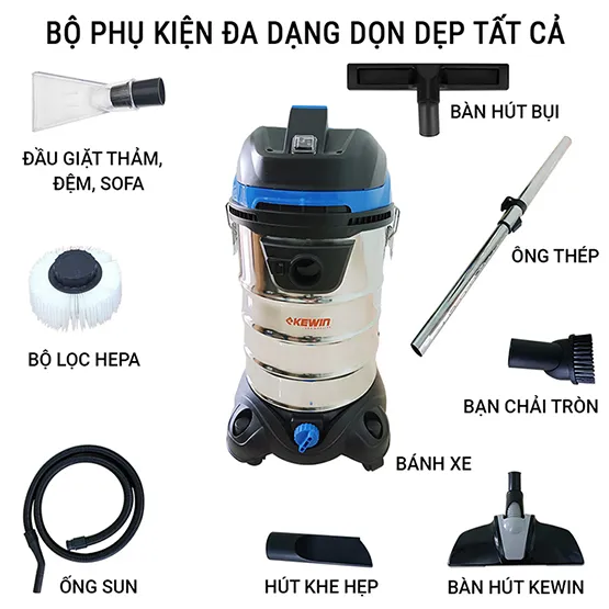 Phụ kiện | 1 ống sun, 1 bàn hút khô và ướt kewin, 1đầu hút khe, 1 đầu chổi tròn xoay 360 độ, 1 túi lọc vải tiêu chuẩn, 1 bộ lọc HEPA, 1 ống rút inox |