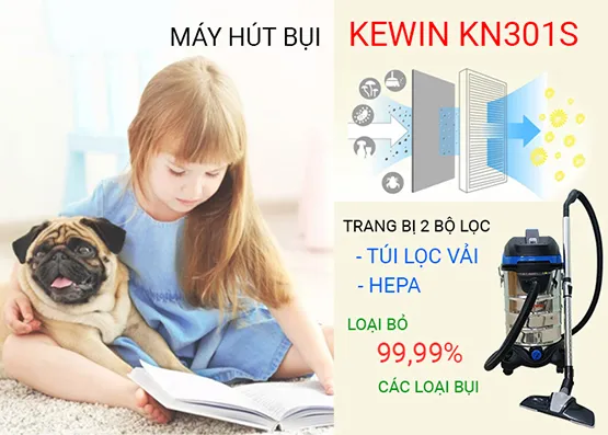 Máy Hút Bụi Kewin KN301S, dung tích 30 lít, trang bị động cơ siêu khỏe 2200 W, chuyên dùng hút bụi cho gia đình, văn phòng, công ty, cửa hàng, … có diện tích nhỏ, hút không thường xuyên.