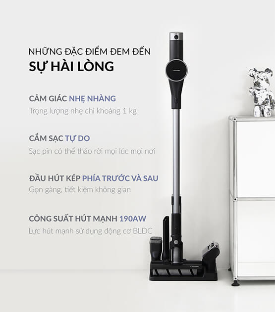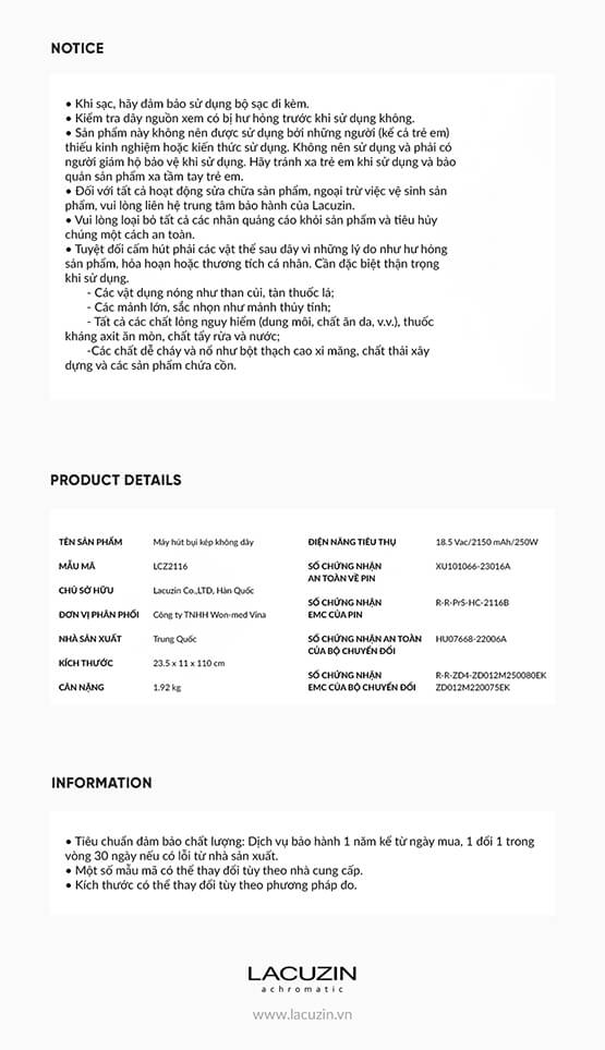 Máy hút bụi kép không dây Lacuzin LCZ2116. Dòng Sp cao cấp từ Korea, công suất 250W, pin Lithium-ion 2100mAh (Có thể tháo rời). Sử dụng 27 phút.