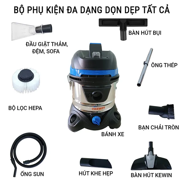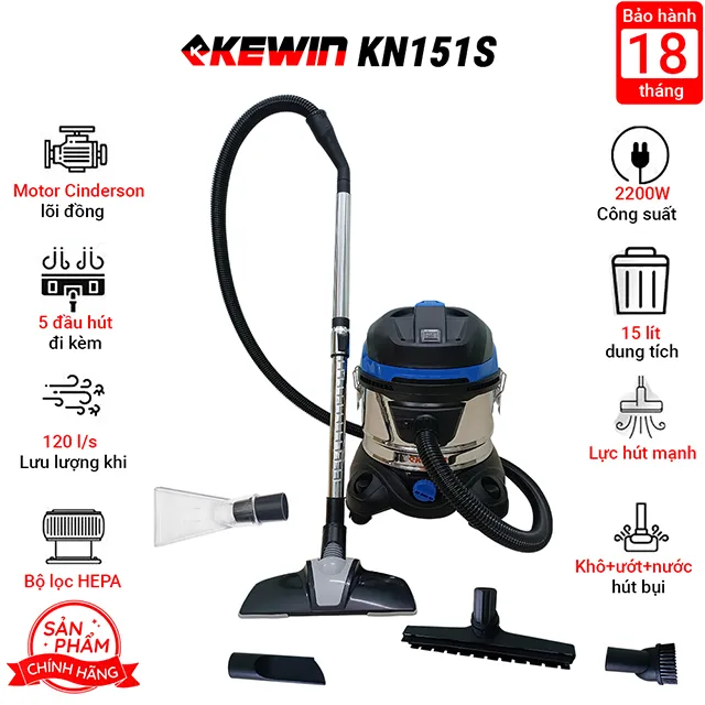 Máy hút bụi Kewin KN151S. Công suất 2200W, dung tích 15 lít. Hút bụi / Hút nước/ Thổi bụi/ Giặt thảm ghế Sofa. Hàng chính hãng, BH 18 tháng, giá tốt nhất thị trường