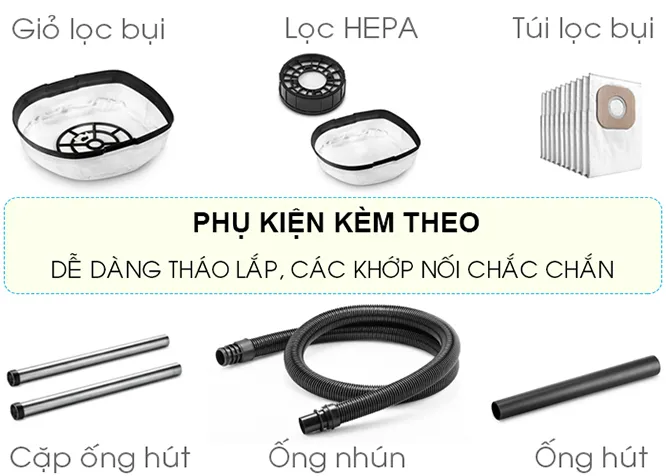 Bộ phụ kiện kèm theo máy hút bụi công nghiệp Karcher T 11/1 Classic bao gồm: giỏ lọc bụi, lọc HEPA, túi lọc bụi, bộ ống hút bụi, ống nhún hút bụi.