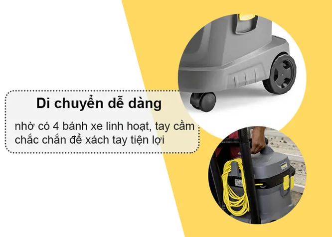Máy hút bụi khô công nghiệp Karcher T 11/1 Classic *EU di chuyển dễ dàng nhờ 4 bánh xe chống ồn, rất chắc chắn. Nhờ được tối ưu hóa thiết kế gọn nhẹ chỉ 3.8Kg.