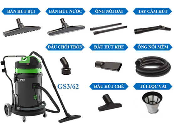 | Phụ kiện | Ống xoắn 2,5m; Ống hút nhựa lõi nhôm dài 50mm x2; Tay cầm với lỗ thoát khí; Bàn hút bụi; Bàn hút nước; Đầu hút dẹt; Đầu hút chổi tròn; Đầu adapter; Lọc vải; Ống thoát nước thải. |