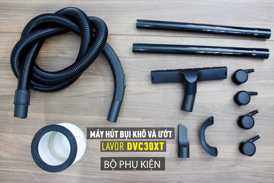 Bộ phụ kiện kèm theo máy hút bụi Lavor DVC30XT bao gồm: Ống nhún, 2 ống nối, bàn hút bụi, đầu hút dẹt dùng để hút các vị trí hẹp hút khoẻ hơn, filter lọc bụi.