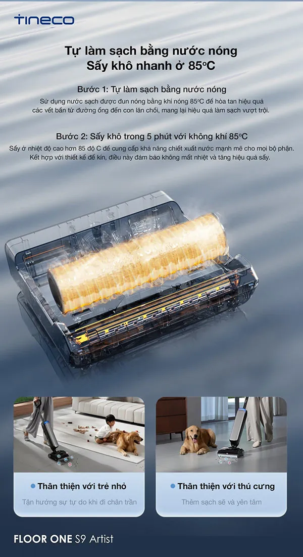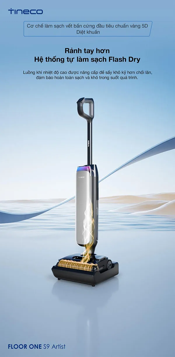 – Công nghệ FlashDry 85°C tự động làm sạch và sấy khô chổi lăn.
