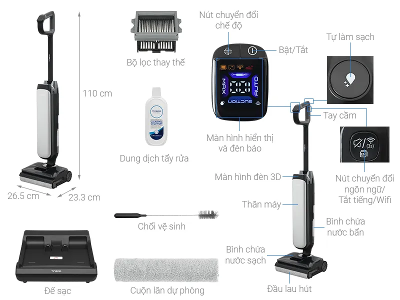 | Phụ kiện | Nước lau sàn; Adapter; Khay đựng; Dụng cụ vệ sinh; Lọc HEPA; Con lăn bổ sung |