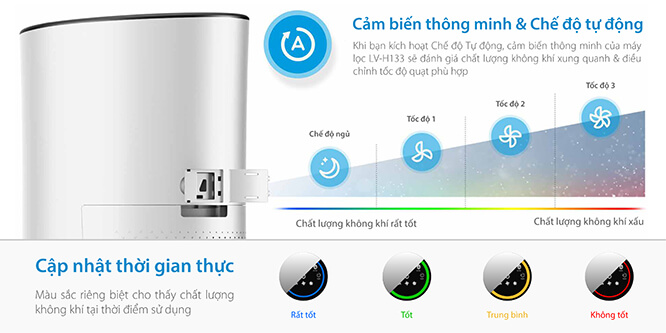 Chế độ tự động: Ở chế độ tự động, cảm biến bụi tích hợp sẽ giám sát Chất lượng không khí xung quanh bạn và điều chỉnh tốc độ quạt phù hợp nhất.