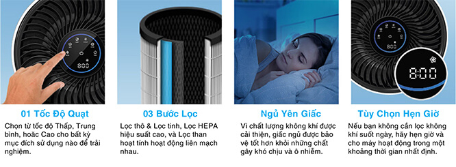 Công nghệ lọc không khí và lốc xoáy 360 °: với bộ lọc 360°, máy lọc không khí có thể hút không khí từ mọi phía, lọc không khí nhiều hơn 40% mỗi giờ và lọc nhanh hơn 40% so với máy lọc không khí khác. Sử dụng bộ lọc sơ bộ tốt, bộ lọc TRUE HEPA và bộ lọc than hoạt tính để loại bỏ hiệu quả 99,97% bụi, phấn hoa, khói, mùi, bào tử nấm mốc và vẩy da thú cưng; lọc các hạt nhỏ đến 0,3 micron và ngay cả bụi mịn PM 2.5.