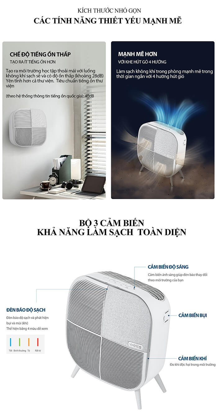 | Cảm biến | Cảm biến bụi, Cảm biến chất lượng không khí, Cảm biến mùi |