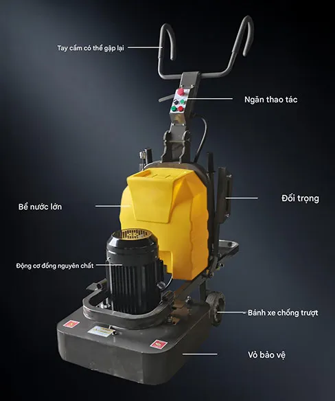 – Hệ thống đầu mài: 12 đầu mài giúp bề mặt sàn nhẵn mịn và đồng đều.