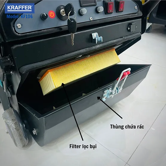 Máy quét rác đẩy tay Kraffer được trang bị bộ lọc bụi tiên tiến, đảm bảo rằng bụi mịn không bị phát tán ra không khí, giúp duy trì môi trường trong lành và an toàn.