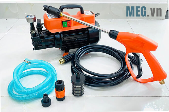 Bộ phụ kiện đầy đủ, đáp ứng tối đa nhu cầu sử dụng của người dùng: 1 súng phun ngắn/có cây nối dài súng, 1 cuộn dây phun 6m, 1 dây hút nước, 1 lọc, 1 khớp nối nhanh, 1 co nối.
