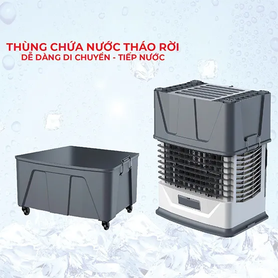 | Tiện ích (hẹn giờ tắt, có hiển thị mực nước…) | – Tạo i-on lọc không khí – Có thang hiển thị mực nước – Đảo gió tự động 2 chiều trái – phải – Thùng nước tháo rời – Hộp đá khô làm mát – Bánh xe di chuyển |