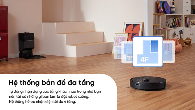Nhà của bạn không chỉ có 1 tầng? Hệ thống bản đồ đa tầng sẽ tự động nhận dạng các tầng khác nhau trong ngôi nhà của bạn. Tất cả những gì bạn cần làm là đặt robot xuống. Hệ thống hỗ trợ nhận diện tối đa 4 tầng.