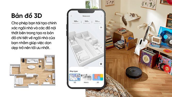 Bản đồ 3D cho phép bạn tái tạo chính xác ngôi nhà của mình và các đồ nội thất bên trong để xây dựng bản đồ chi tiết về ngôi nhà của bạn, nhằm đảm bảo việc dọn dẹp trở nên tối ưu nhất