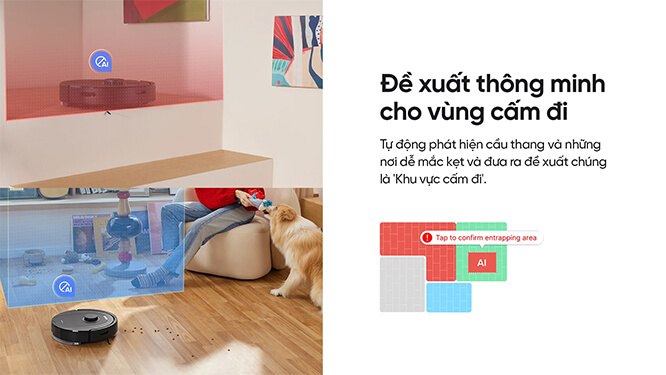 Tự đồng điều hướng để Robot tránh các khu vực dễ mắc kẹt khi di chuyển và đưa ra đề xuất cho các khu vực hạn chế đi vào. Tạo nên bức tường ảo ngăn Robot đi vào các khu vực nhất định thông qua Roborock App.