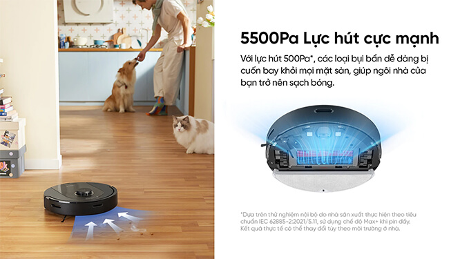 Với lực hút 5500Pa, các loại bụi bẩn dễ dàng bị cuốn bay khỏi mọi mặt sàn, giúp căn nhà của bạn trở nên sạch bóng.