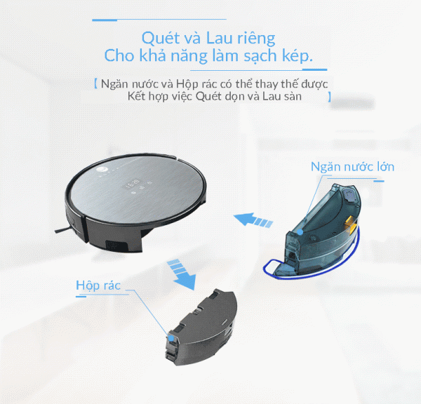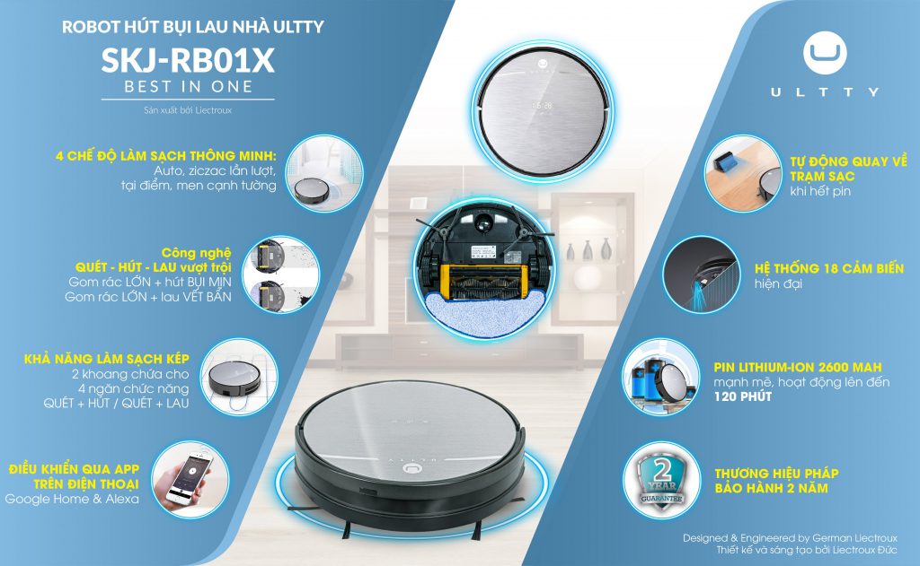 Thiết kế 2 khoang với 4 ngăn riêng biệt, Ultty SKJ RB01X có thể hoạt động 2 tác vụ quét & hút hoặc quét & lau trong cùng một lúc. Ultty SKJ RB01X hoạt động được trên nhiều loại mặt sàn như sàn gạch, gỗ, thảm hay sofa