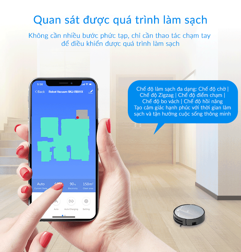 – Vẽ bản đồ 2D toàn căn hộ trên app: Thông qua kỹ năng lập bản đồ 2D, Ultty SKJ RB01X tự tính toán và làm sạch một cách thông minh nhất, không lặp lại đường đi cũ, đồng thời hiển thị toàn bộ lộ trình làm sạch trên bản đồ, giúp người dùng dễ dàng biết robot đã làm sạch đúng theo yêu cầu hay chưa!