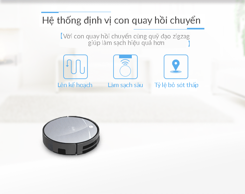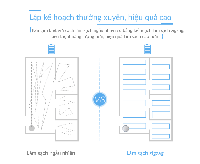 Hướng di chuyển zíc zắc cho phép robot có thể bao quát toàn bộ bề mặt sàn, làm sạch lên đến 98% tỷ lệ bề mặt, tỷ lệ lặp lại đường đi hoặc bỏ sót khu vực dọn dẹp giảm xuống cực thấp, tiết kiệm năng lượng.