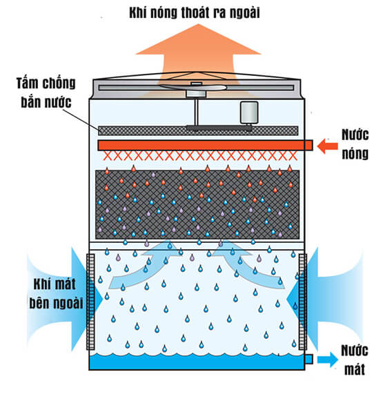 Quạt trên đỉnh tháp quay sẽ hút khí lạnh từ bên ngoài vào tháp qua phần lưới xám. Khí lạnh được đẩy từ dưới đáy lên đến khi “va chạm” với tấm tản nhiệt chứa nước nóng. Khi không khí và nước kết hợp với nhau, một lượng nhỏ nước nóng bay hơi, tạo ra hành động làm mát.