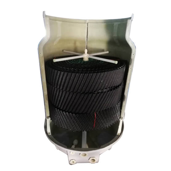 Nước nóng thường do dàn ngưng điều hòa không khí hoặc các hệ thống máy móc công nghiệp khác. Lượng nước này được bơm trực tiếp qua các đường ống vào tháp giải nhiệt. Nước theo ống dẫn đến các đầu phun và phun trực tiếp lên tấm tản nhiệt. Lượng nước phun nhỏ, từ từ làm cho bề mặt tấm tản nhiệt có nước nóng có thể để tiếp xúc tối đa nhất với không khí.