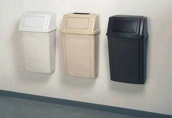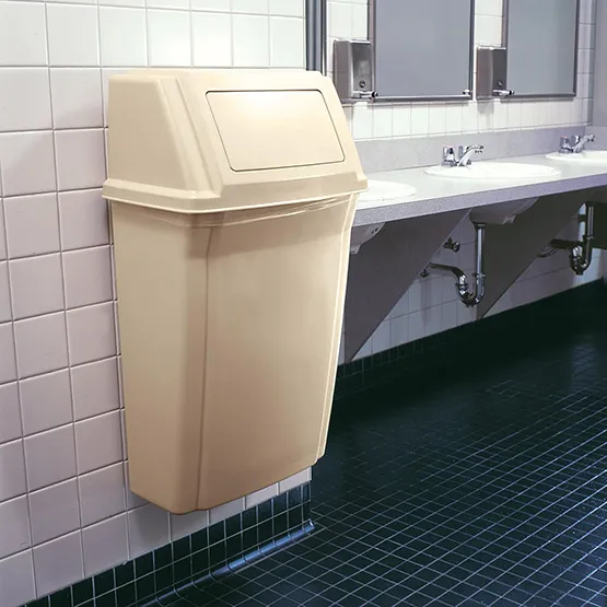 Thùng rác gắn tường Rubbermaid FG782200BEIG (57 lít – 15 GAL). Giải pháp lý tưởng cho không gian nhà bếp, phòng tắm, hành lang và các khu vực hẹp khác.